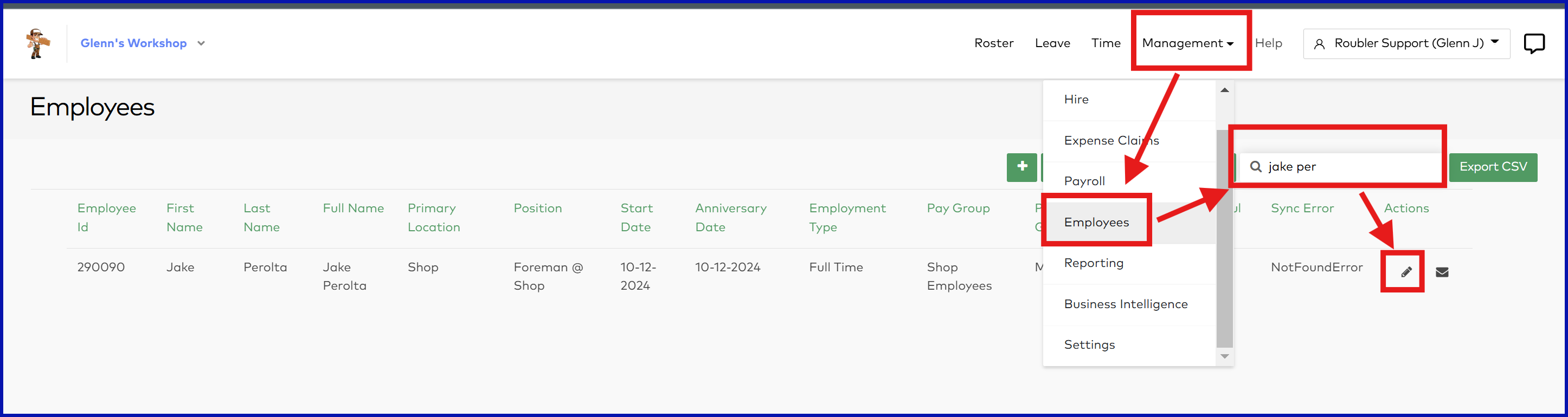 Search for the employee experiencing the issue and click the pencil icon to edit their details.